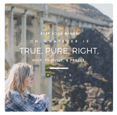 “Finally, brethren, whatever things are true, whatever things are noble, whatever things are just, whatever things are pure, whatever things are lovely, whatever things are of good report, if there is any virtue and if there is anything praiseworthy—meditate on these things.”