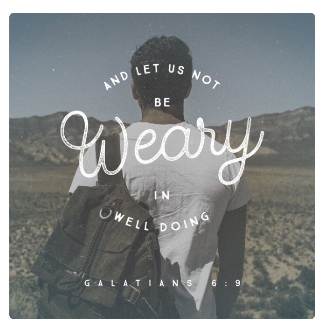 “So let’s not allow ourselves to get fatigued doing good. At the right time we will harvest a good crop if we don’t give up, or quit. Right now, therefore, every time we get the chance, let us work for the benefit of all, starting with the people closest to us in the community of faith.”