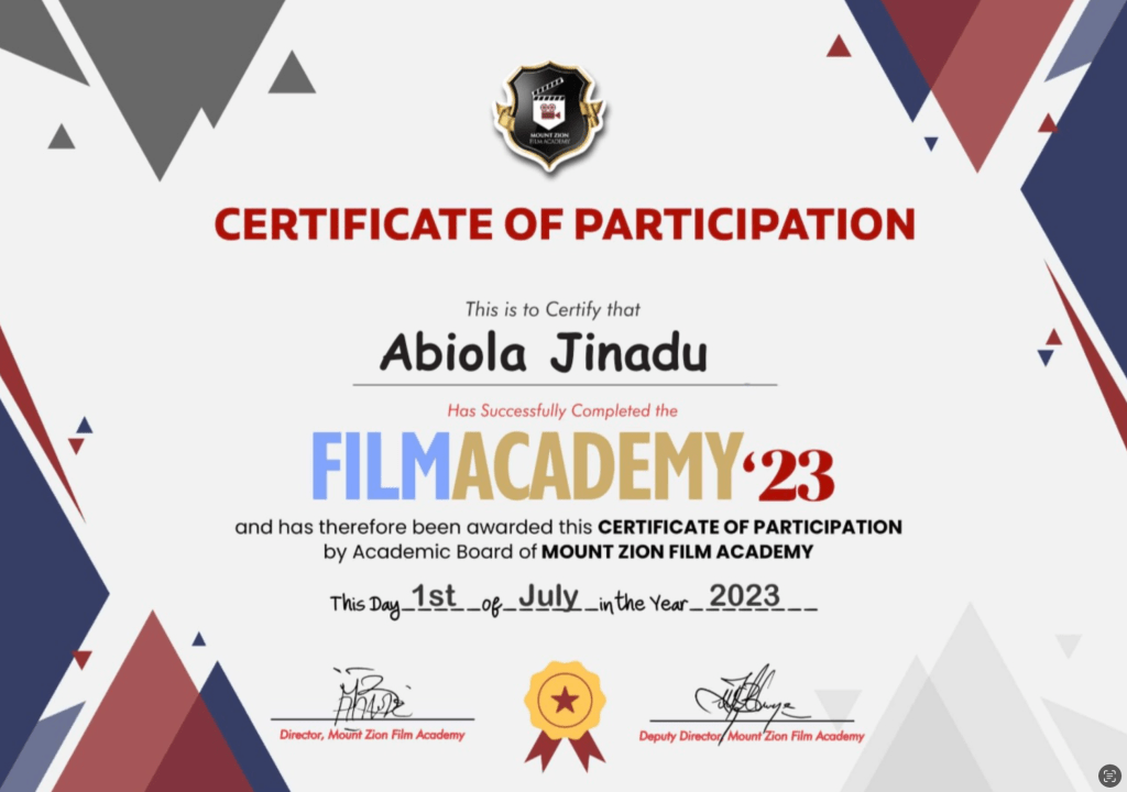 In June 2023, I signed up for a class with Mount Zion Film Academy and my group’s short film (where I played the lead role) stood out and Daddy Mike Bamiloye himself expressed this to the entire class (over 459 participants). Glory be to God forevermore. Our short film has gone on to win a regional award with Mount Zion Institute Alumni International Fellowship. Once we’re allowed to share, I will.